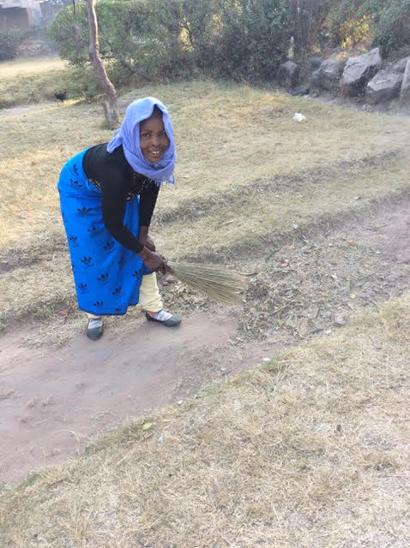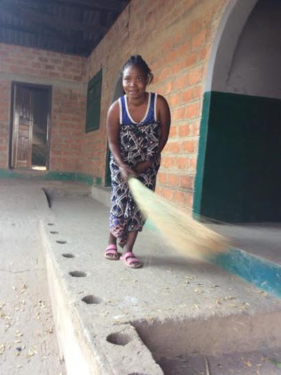 Susan Mwanza sweeping the corridors. She participates in the micro business ventures and is a very good cook and helps Benadette baking. Her goal is to open her own restaurant.
