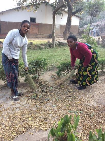 Brenda and Mary Bwalya helping each other sweep. It was windy and much help was needed to tidy the compound.