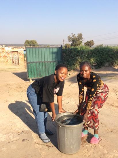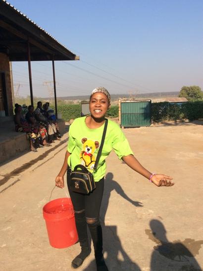Blessings, member of the bakery department, gives a big smile as she fetches water.