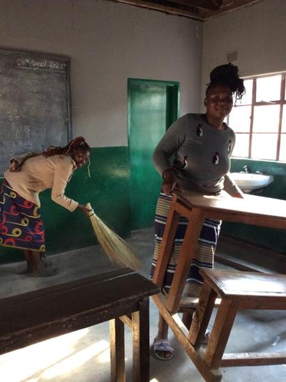 A clean environment is very important here at Living Compassion, and everyone participates in cleaning. Here, Karen helps Onesta clean the baby class before the little ones come in for school.