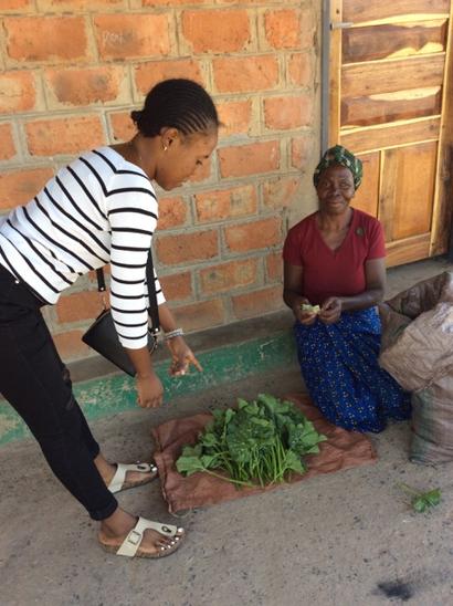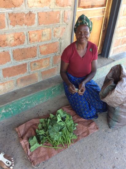 She displays the pumpkin leaves, which are called chibwabwa in Bemba. They are prepared with peanuts or a little cooking oil and eaten with nshima.