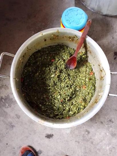 Here is a pot of pumpkin leaves in peanut butter sauce that we call iyakushashila. It is very tasty!
