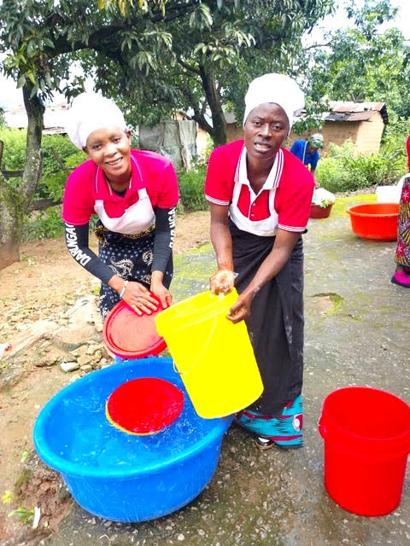 Ester and Elizabeth make sure that the dishes used in the kitchen are sparkling clean. They wash them using our clean water from the Living Compassion tap.