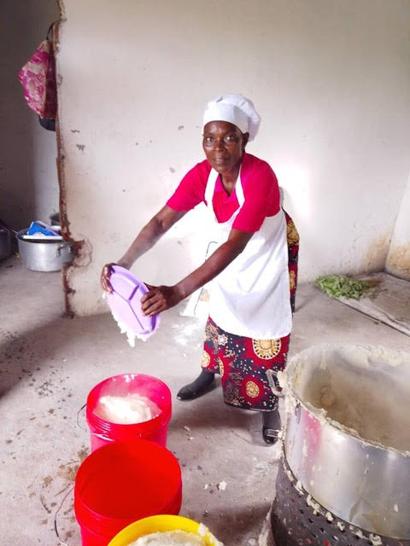 Pauline dishes out nshima from the huge pot. She is a mother of six and has been with us for a long time.