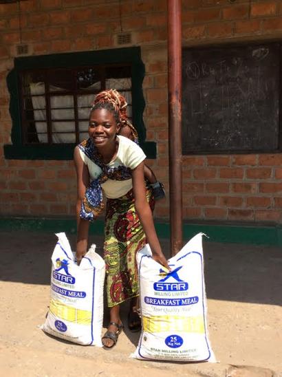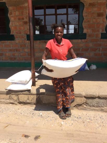 Here is Onesta. She’s the one whose mum died recently and left a baby brother, Comfort. She’s saying "Thank you!" for the bags of mealie meal which are going to help her and her family. Comfort spends his days at Living Companion, too, being passed to many caring arms.