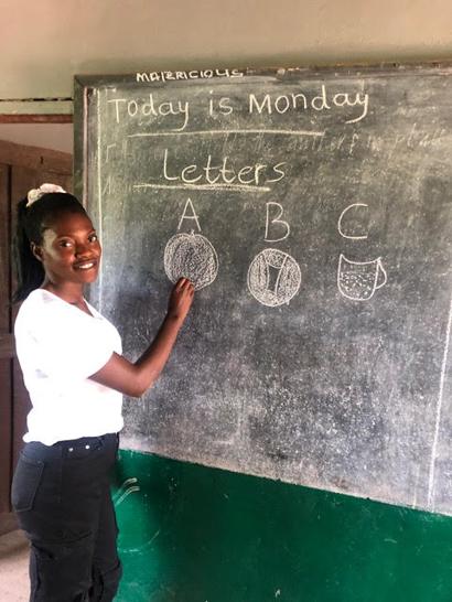 Onesta helping out in Memory's class. She really enjoys teaching the youngest students.