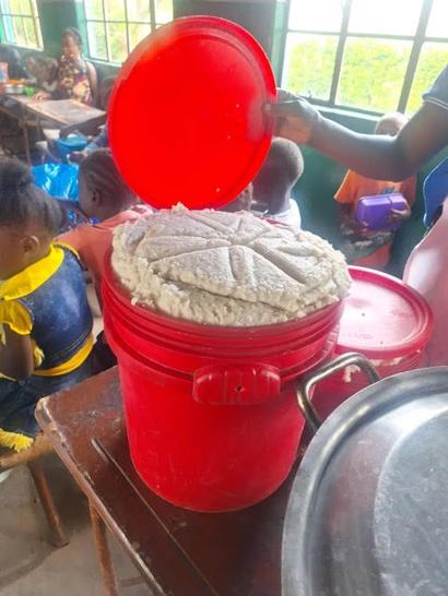 Our main staple food eaten here in Kantolomba is nshima. Here is a bucket that will serve an entire class of students.