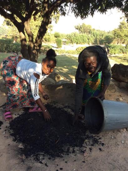 Susan and Charity picking out the larger clumps of charcoal that can be reused.